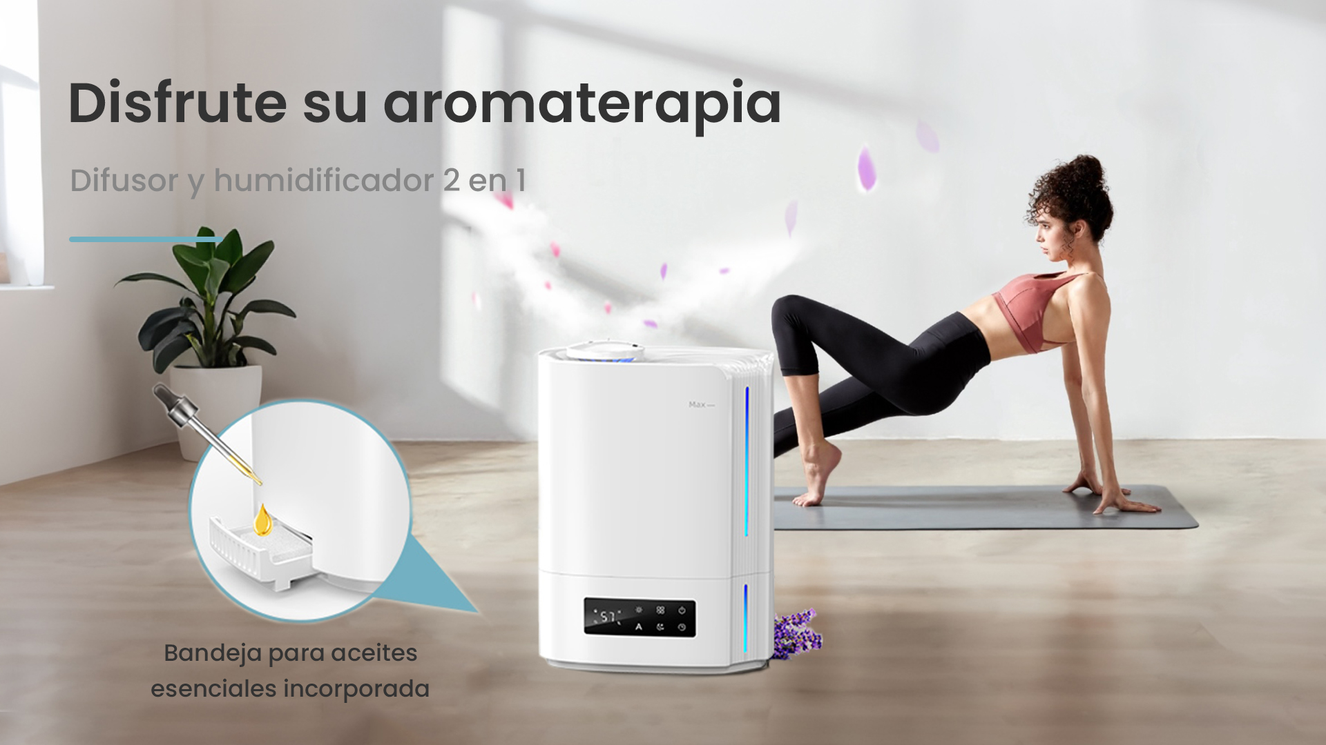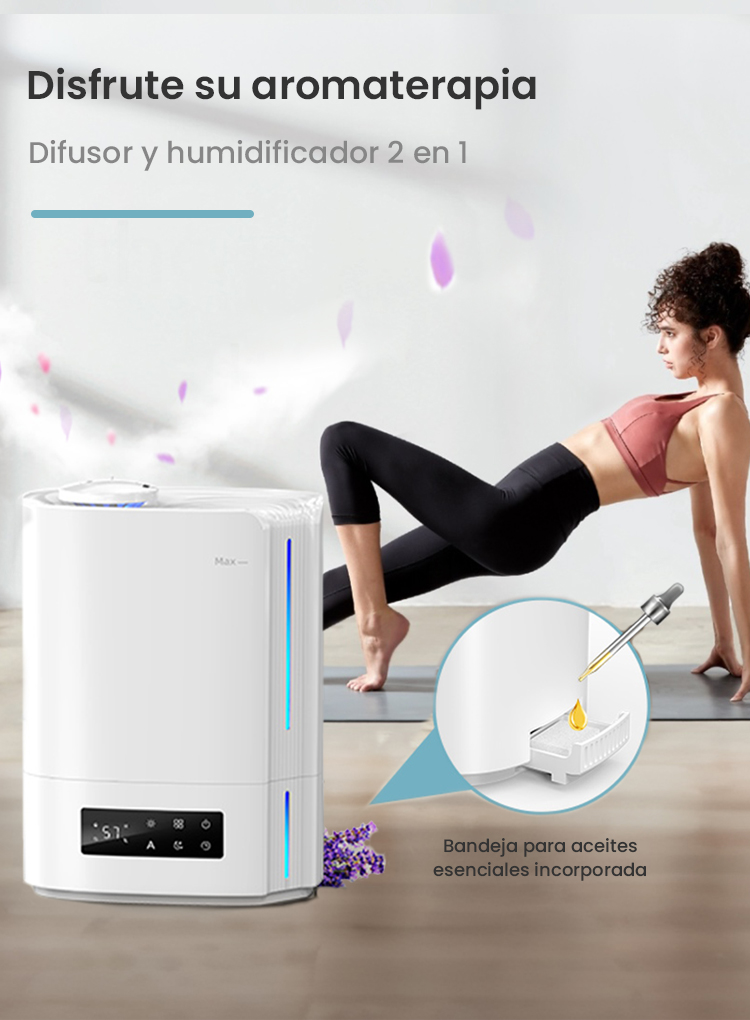Este humidificador tiene un cartucho para aceites esenciales en la base. Puede añadir esencias para humidificador y disfrutar de una experiencia de fragancia agradable. Simplemente agregue de 4 a 5 gotas al cartucho y la delicada niebla de agua esparcirá el aroma por toda la habitación.
