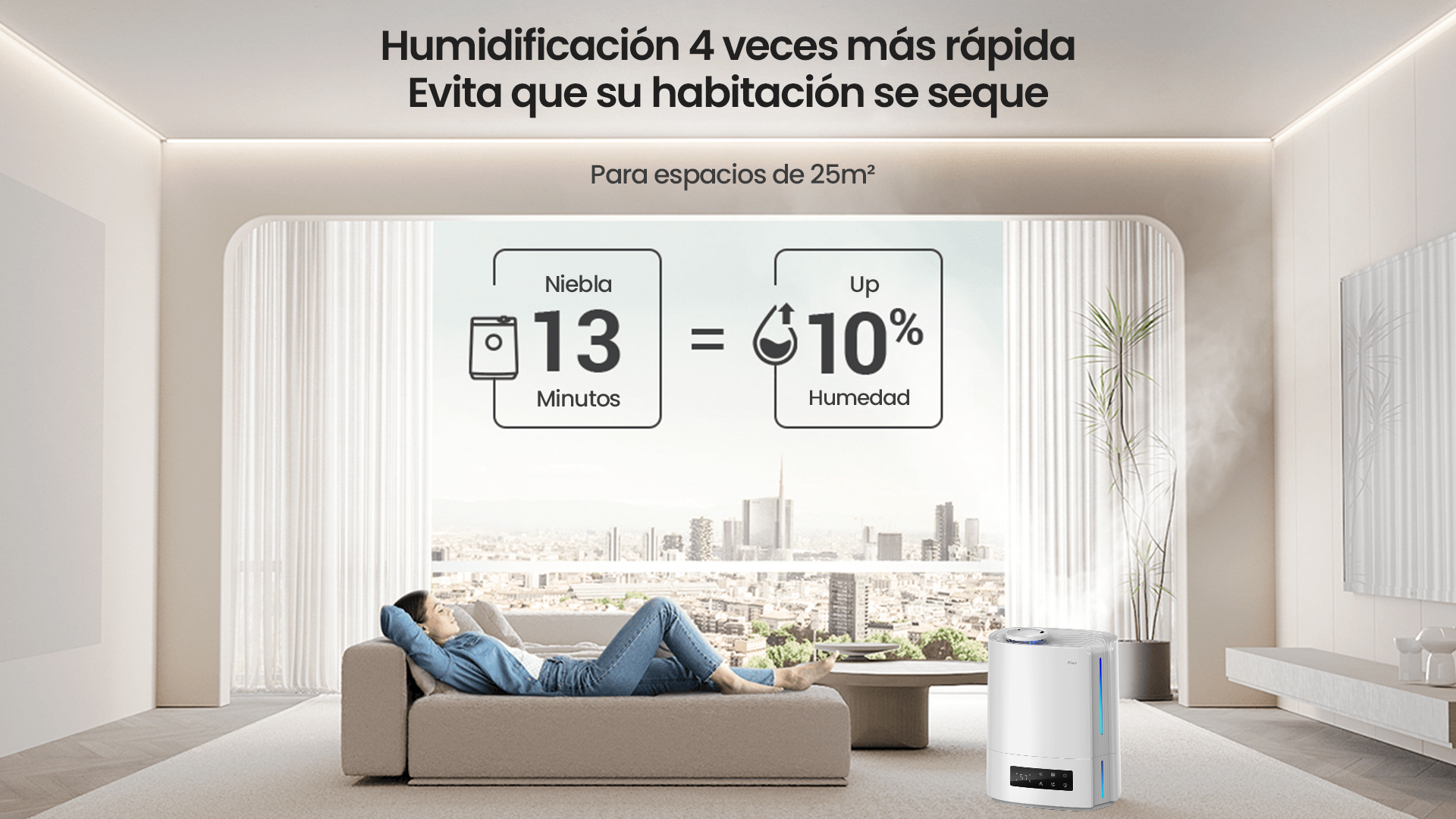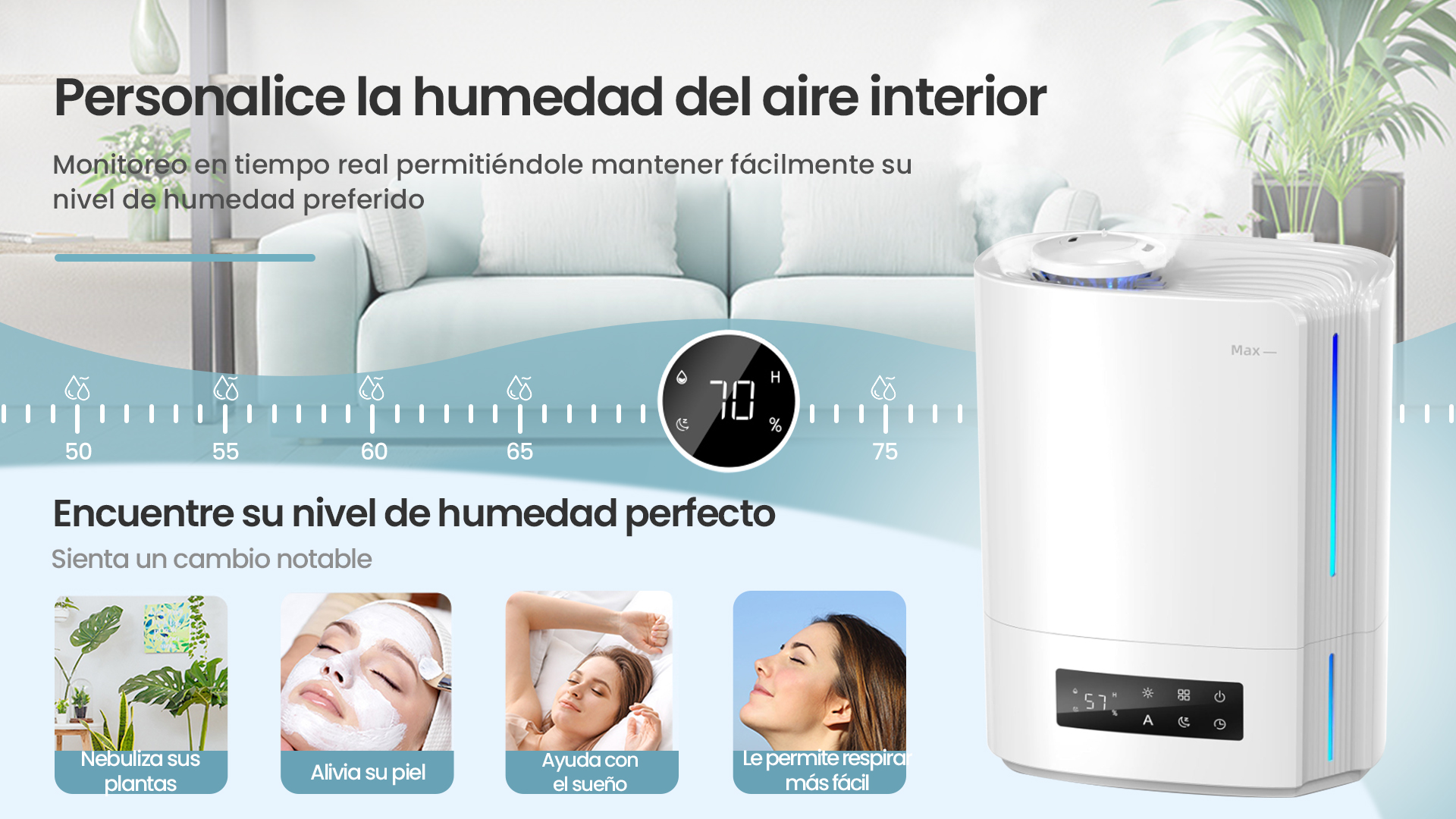 Funcionamiento automático inteligente mediante algoritmos de A.I., calculando los cambios de humedad ambiental y la temperatura, y ajustando de forma automática y dinámica la salida de rocío para mantener una humedad ideal más saludable entre 45% % y 60 %.