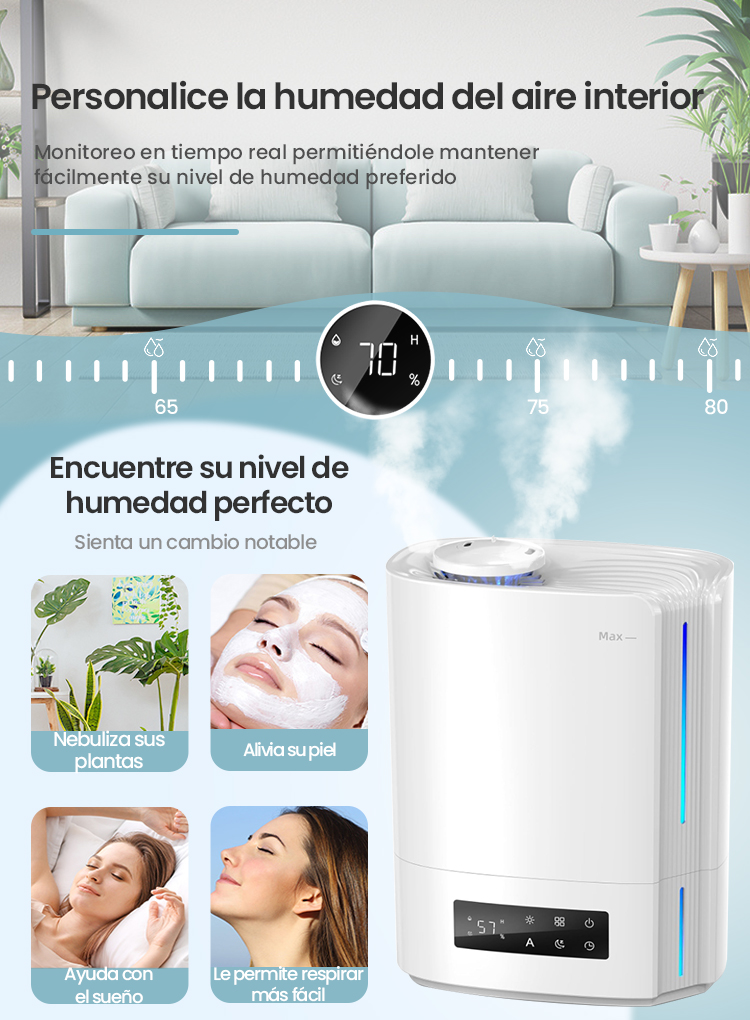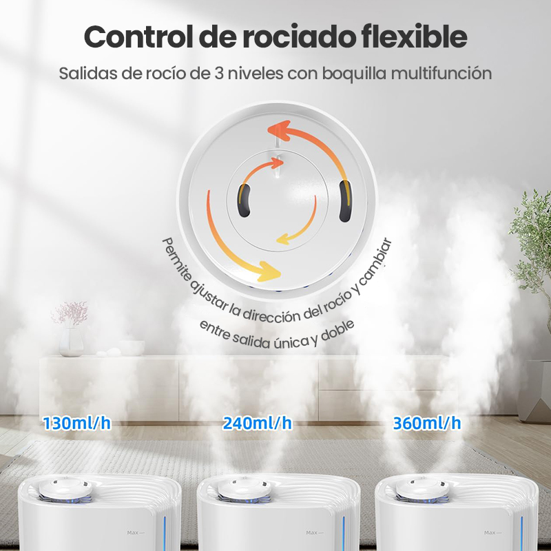 Este humidificador para bebés y habitaciones tiene un diseño de doble pulverización que puede aumentar la humedad del aire hasta un 60% rápidamente. Con una salida máxima de 360 ml/hora y una niebla que puede alcanzar hasta 60 cm de altura, satisface diversas necesidades de humidificación. La boquilla giratoria permite controlar fácilmente la dirección de la niebla. Ofrece múltiples funciones de humidificación, con tres niveles de viento y 8 modos de humedad ajustables de 55% a 90%, para que pueda elegir el modo que mejor se adapte a sus necesidades.
