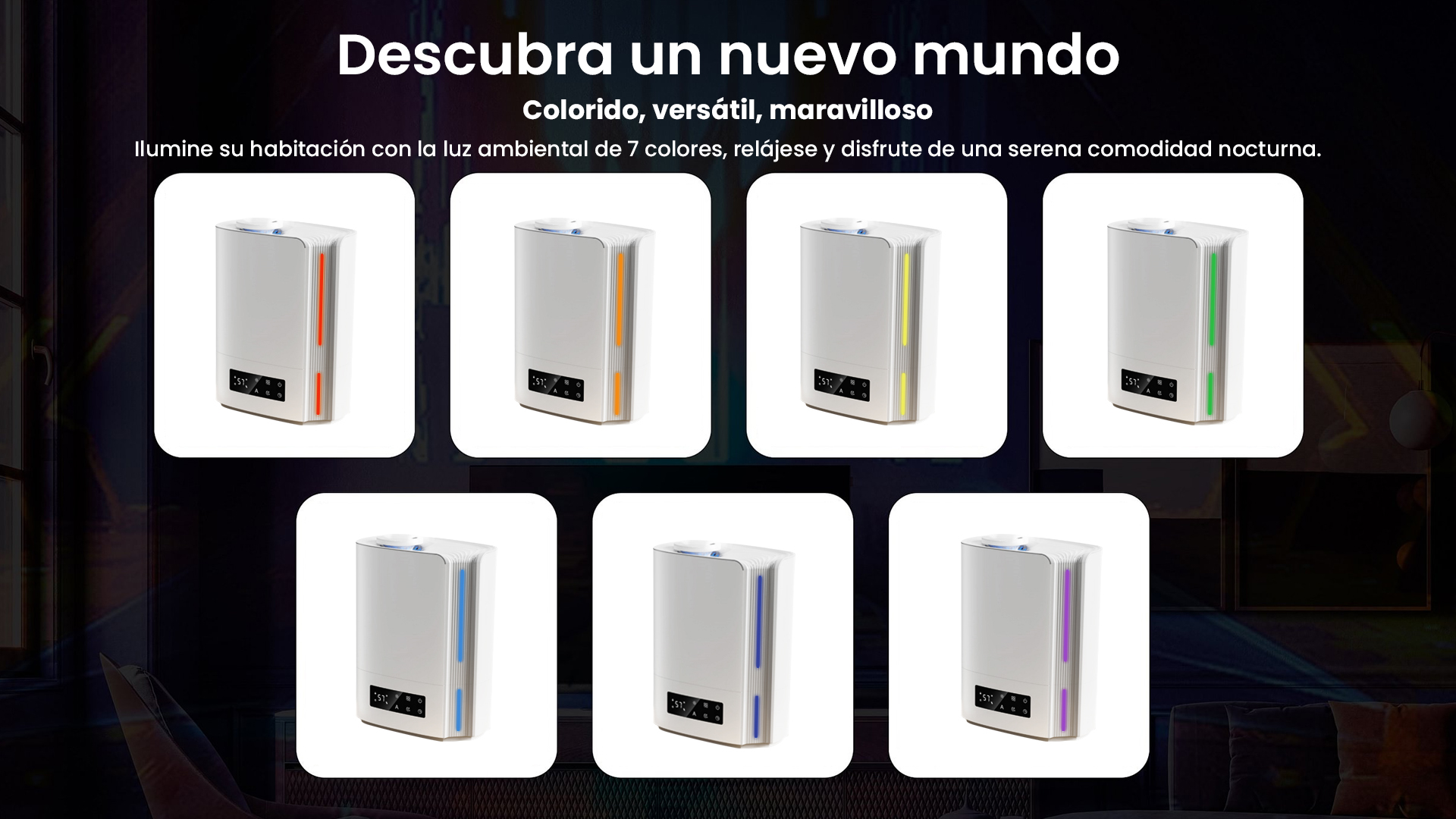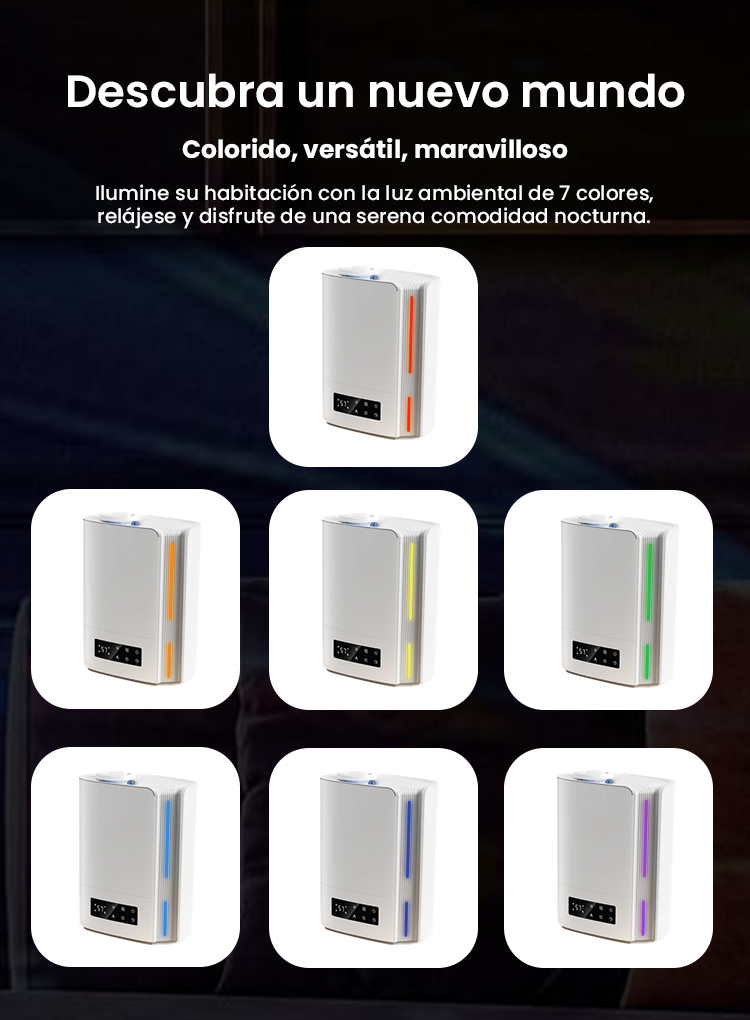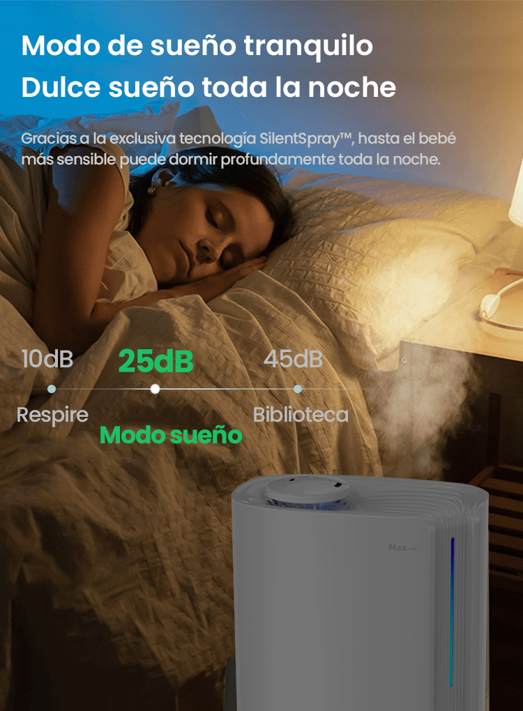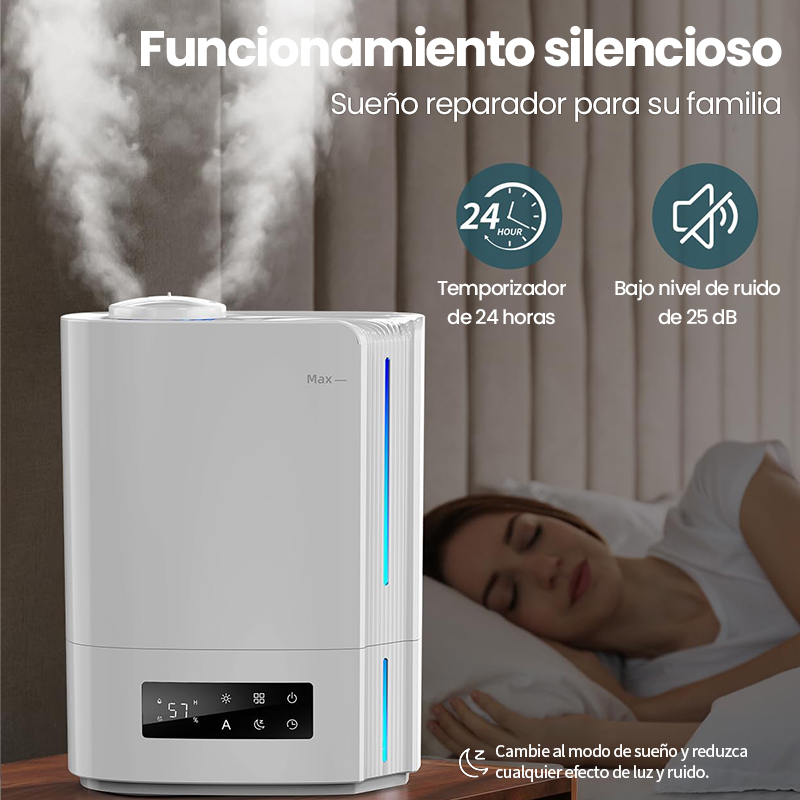 Este humidificador de niebla fría es perfecto para garantizar un sueño reparador. Ayuda a aliviar síntomas molestos como la piel seca, la tos o la nariz bloqueada, mejorando la respiración. Funciona de manera extremadamente silenciosa (≤25db), lo que lo hace ideal para habitaciones de bebés y otras habitaciones donde se necesita silencio. La barra de luz LED en la base proporciona una luz nocturna relajante. El humidificador se apaga automáticamente cuando el depósito está vacío o cuando el temporizador expira, ofreciendo protección inteligente.