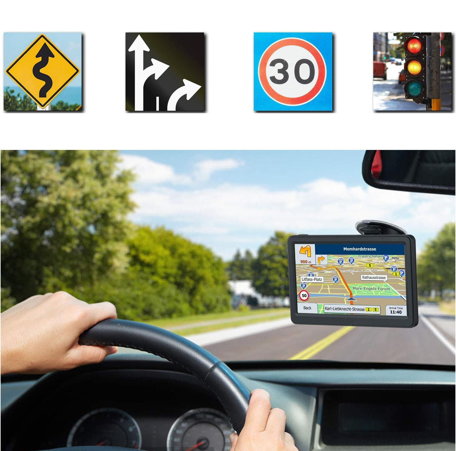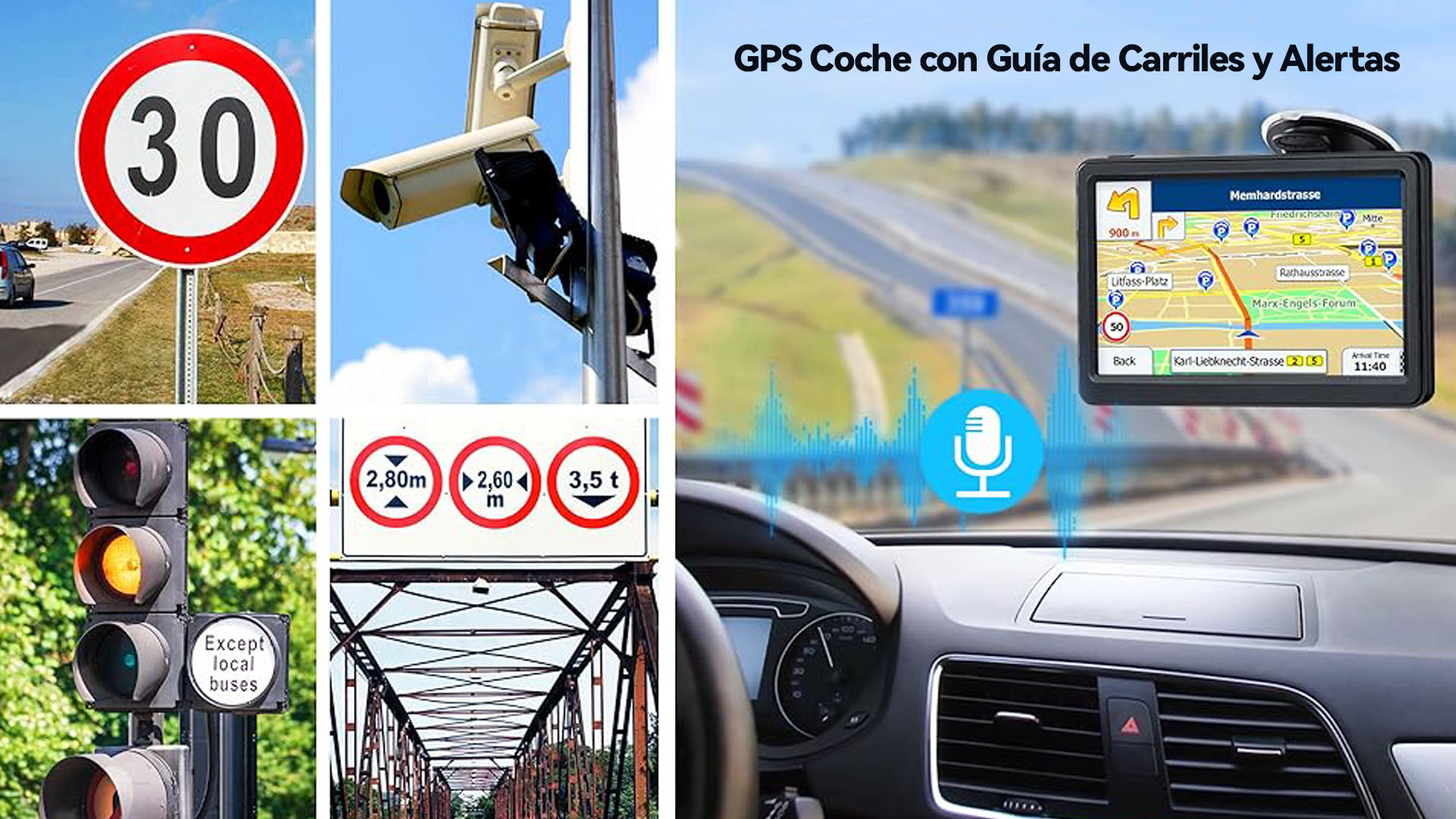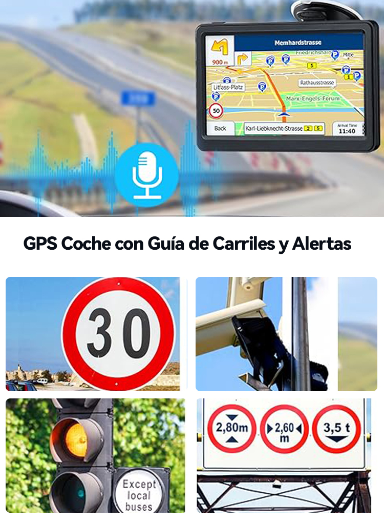 (2) Alertas para conductores, cámaras de velocidad, límite de velocidad, transmisión del nombre de la calle, guía de carril y tiempo estimado de llegada.