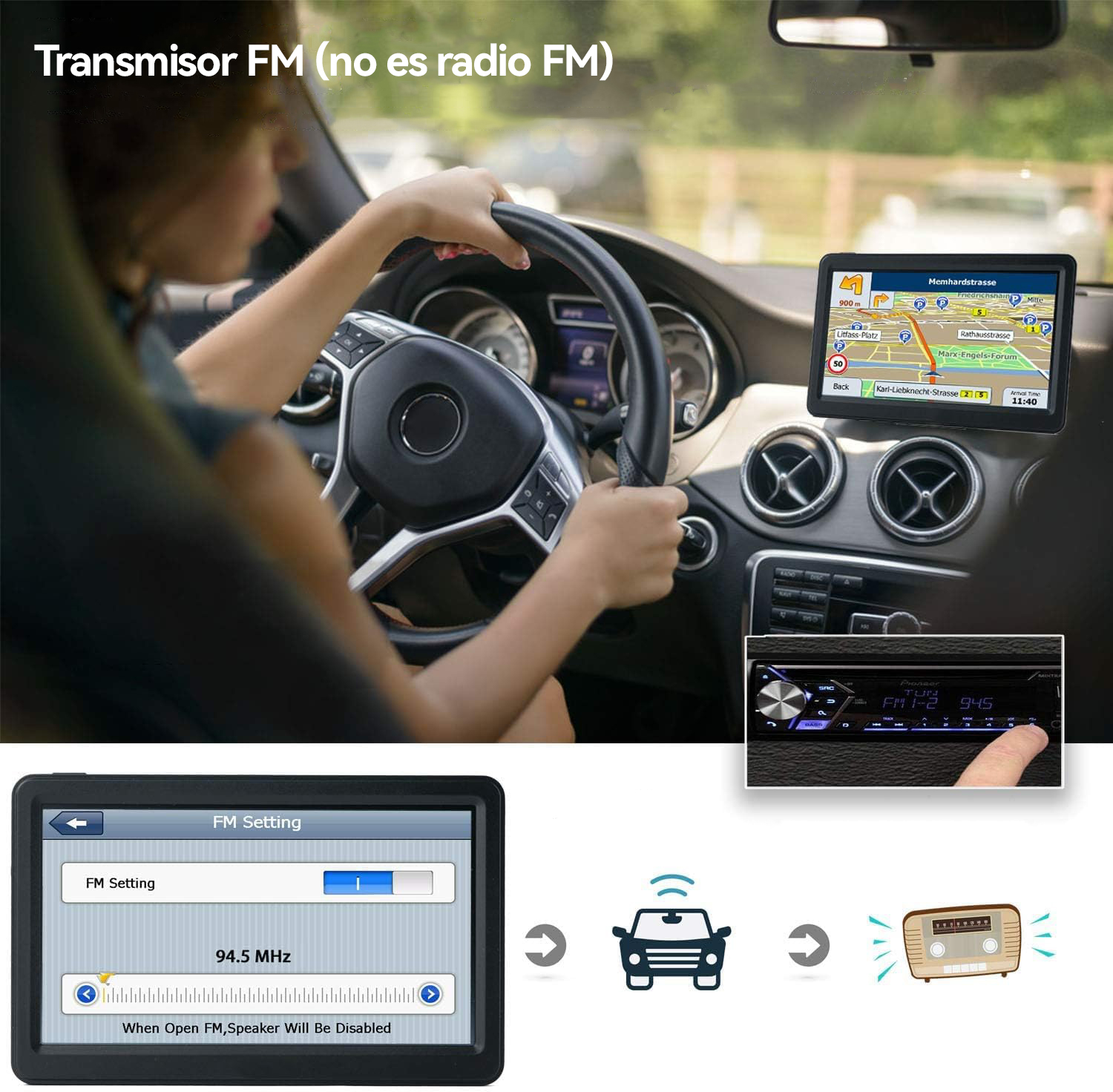 ☑️Función de transmisor FM, no es una radio FM. Envía el sonido de la navegación al radio del coche, haciéndolo más claro y con mayor volumen
