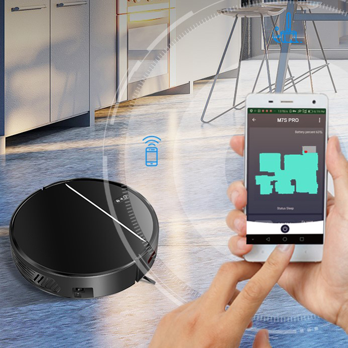 M7S puede conectarse a Internet y controlarse desde allí mediante una aplicación en su teléfono móvil. Con la aplicación puedes, por ejemplo, empezar a limpiar, establecer un período de limpieza, cambiar entre diferentes programas de limpieza y ver cuánta batería queda. Además, M7S también se puede controlar con Alexa o Google Home.
